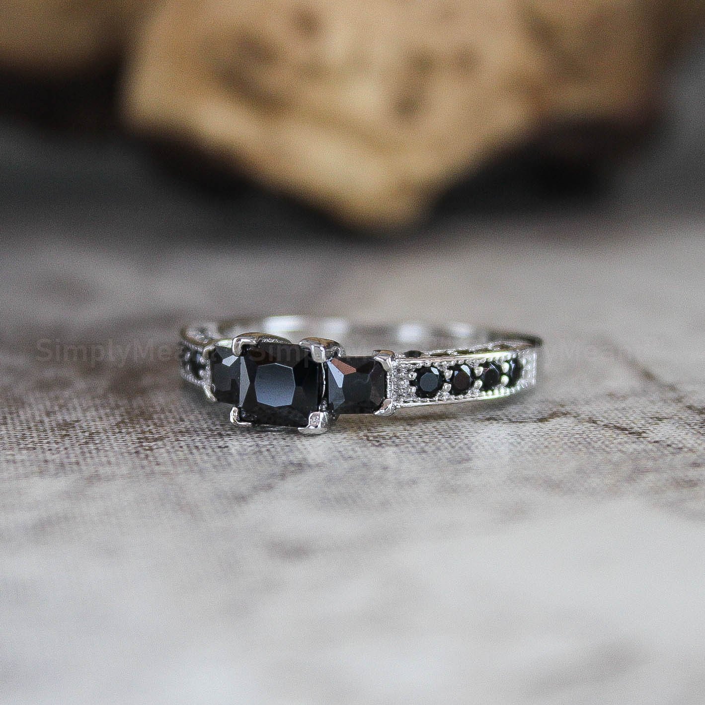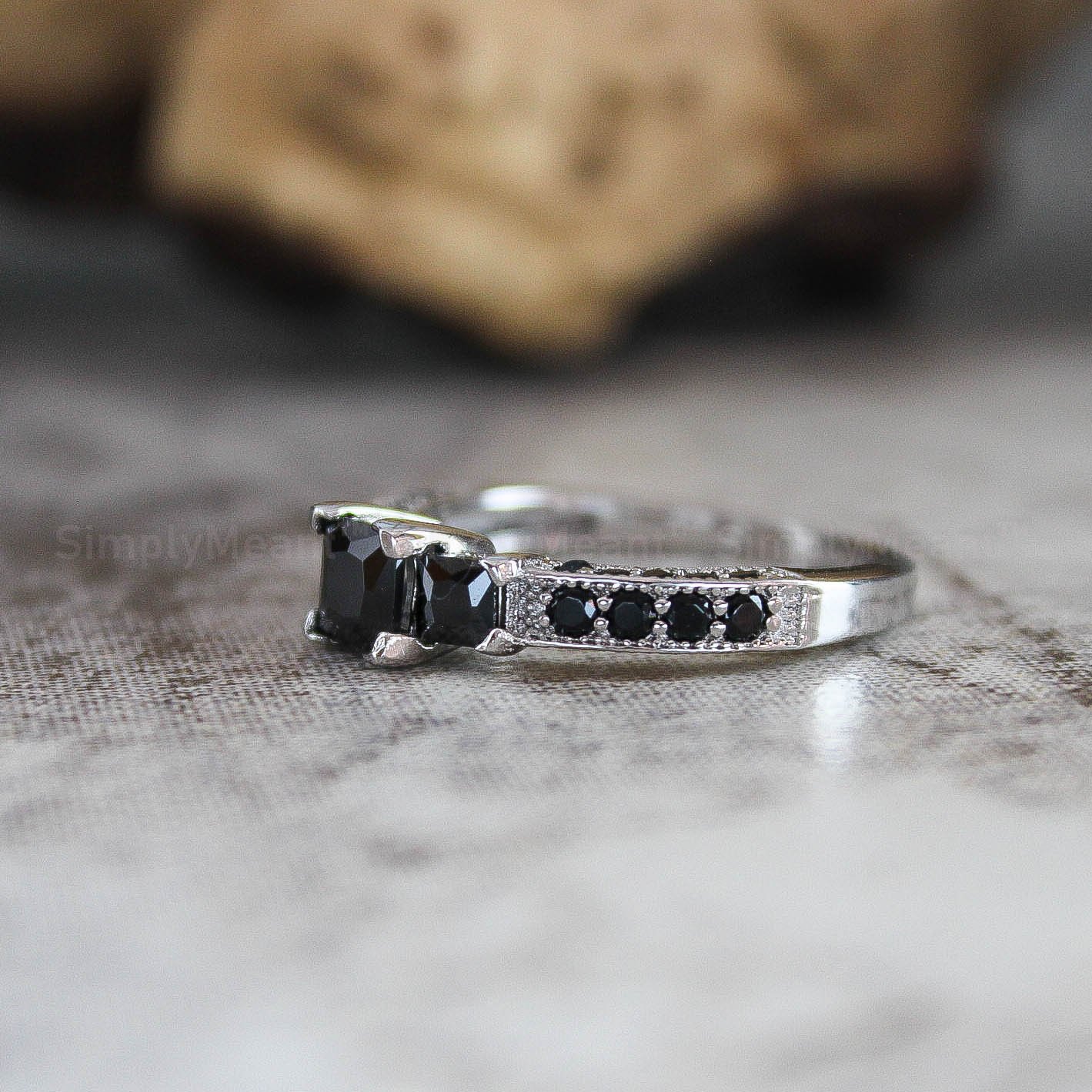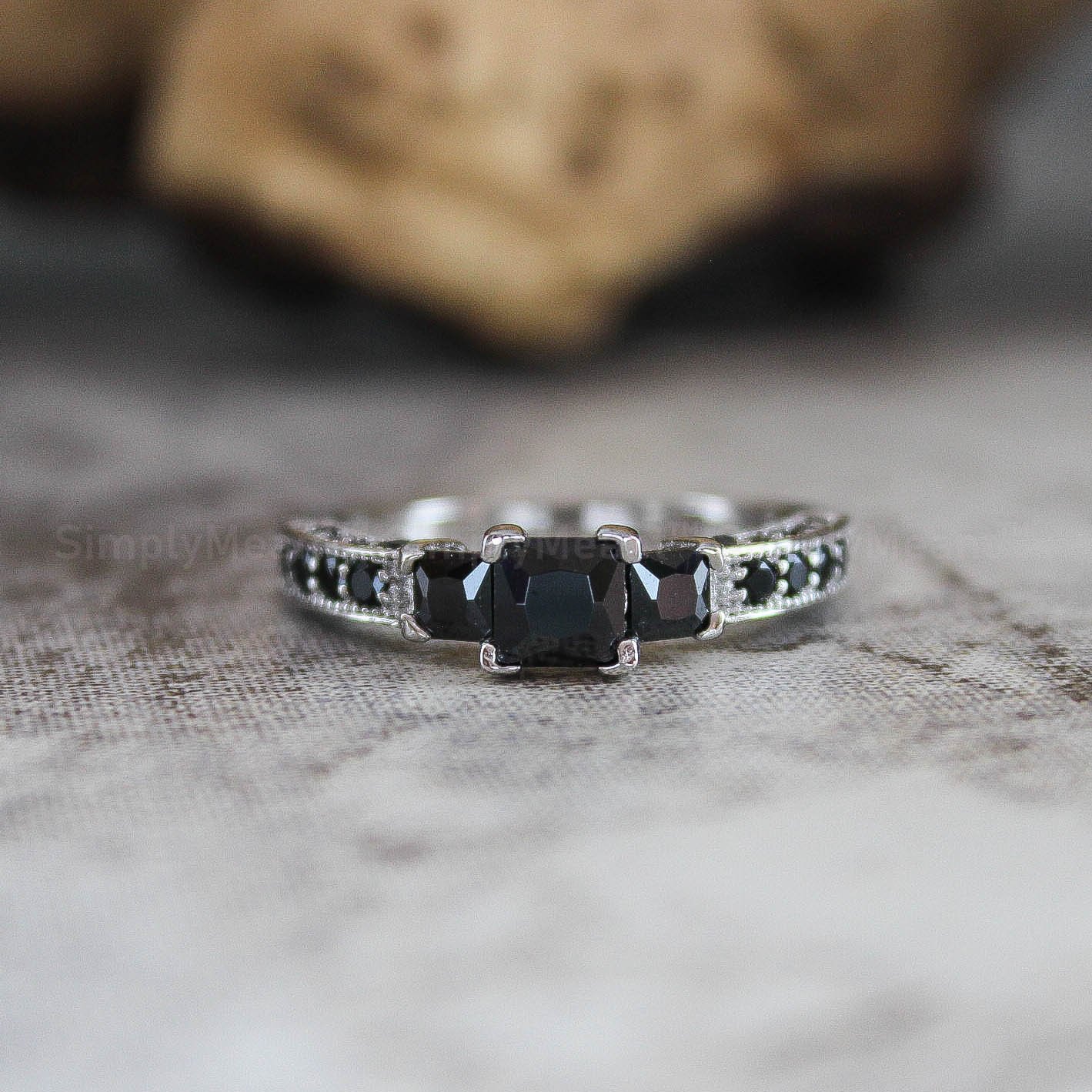 HER RING: 3MM .925 STERLING SILVER THREE STONE BAND PRONG SETTING (20 x OBSIDIAN BLACK DIAMOND CZ (1.5MM), 8 x OBSIDIAN BLACK DIAMOND CZ (2.5MM), 2 X OBSIDIAN BLACK DIAMOND CZ (3.5MM) & CENTER OBSIDIAN BLACK DIAMOND CZ (5.5MM))