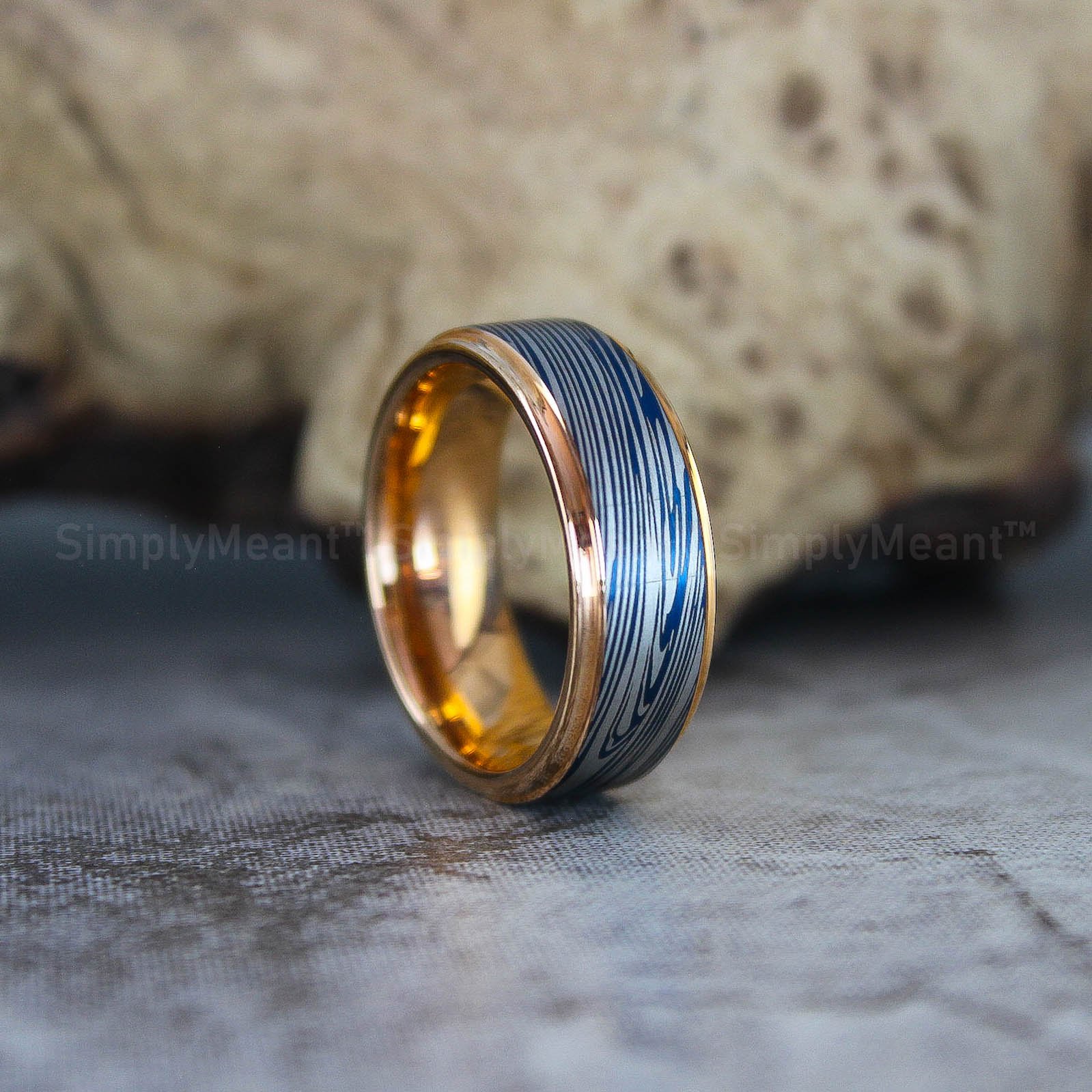 6MM ROSE GOLD TUNGSTEN BAND WITH STEP EDGE BLUE EXTERIOR