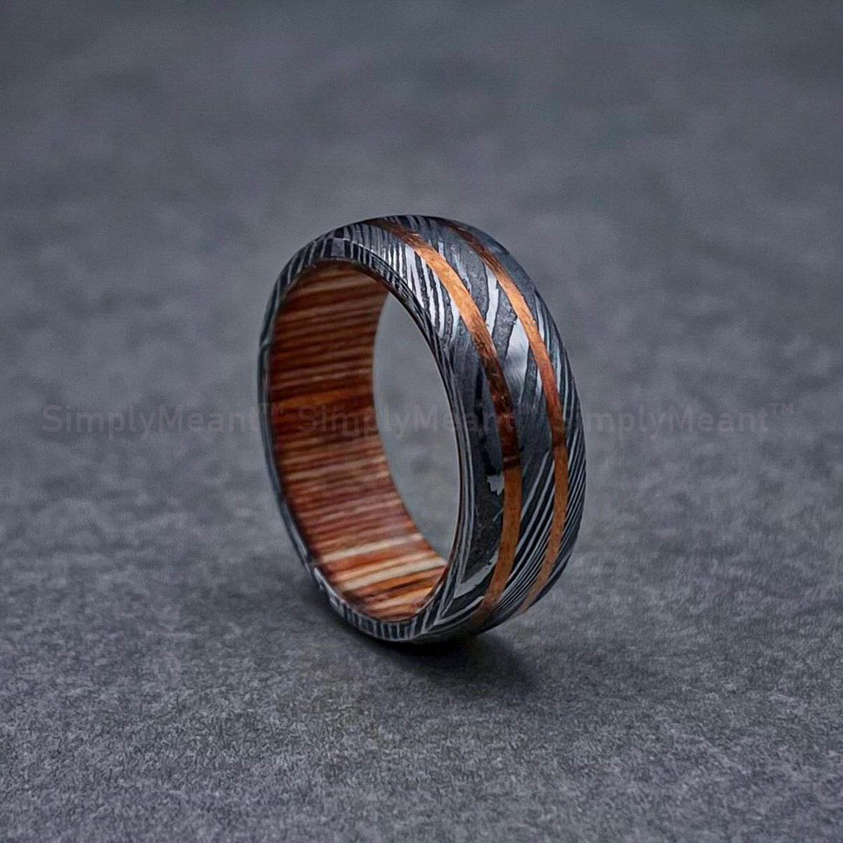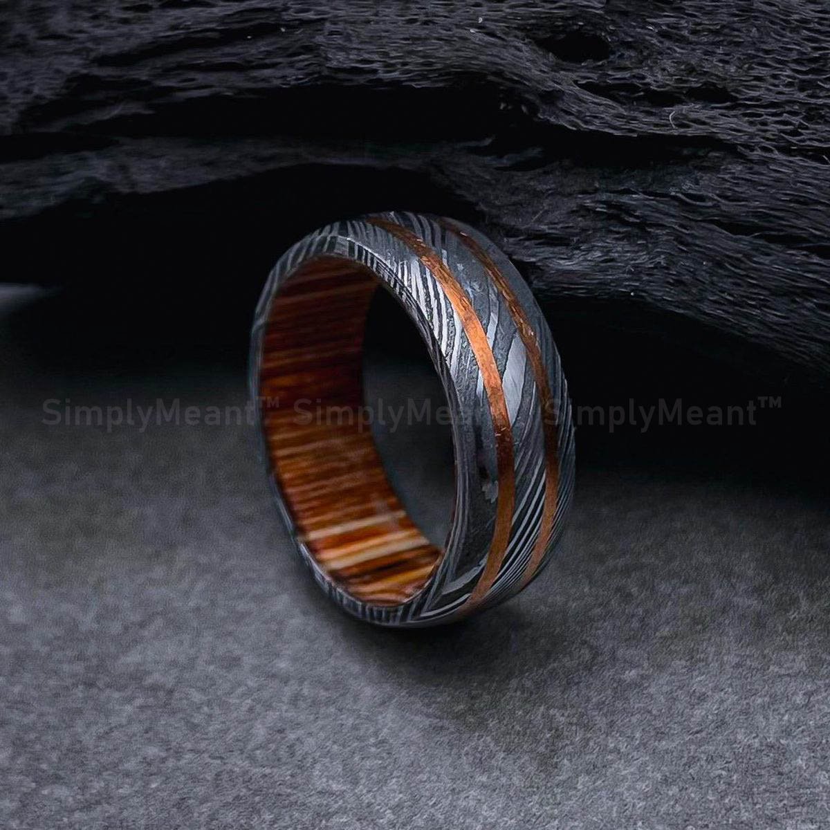 8MM DAMASCUS STEEL BAND WITH WHISKEY BARREL WOOD SLEEVE COPPER INLAY