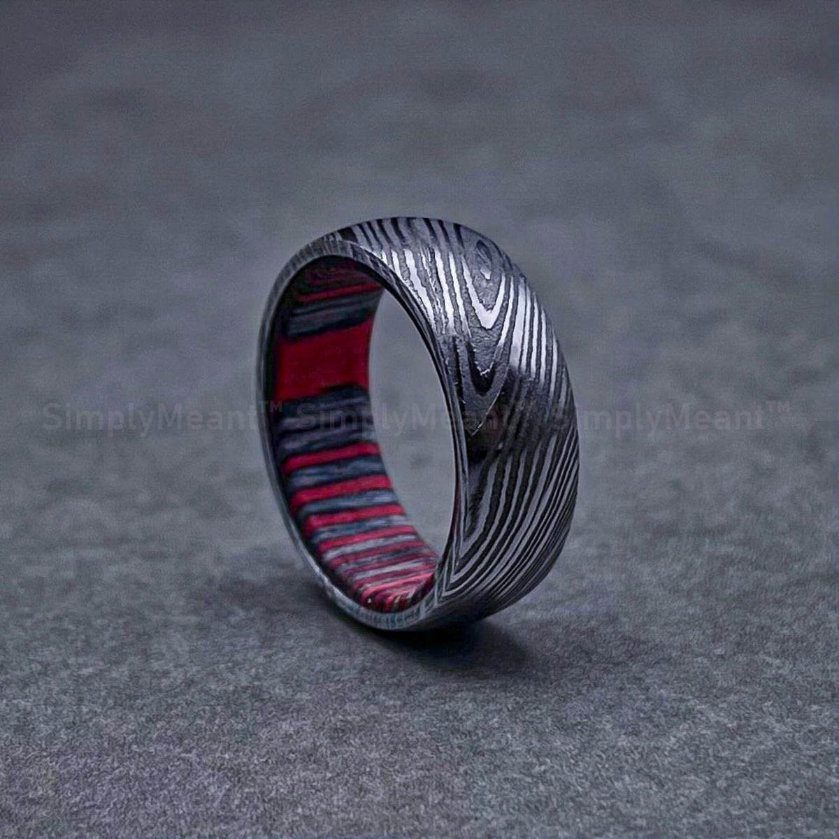8MM DAMASCUS STEEL BAND WITH RED HARDWOOD SLEEVE