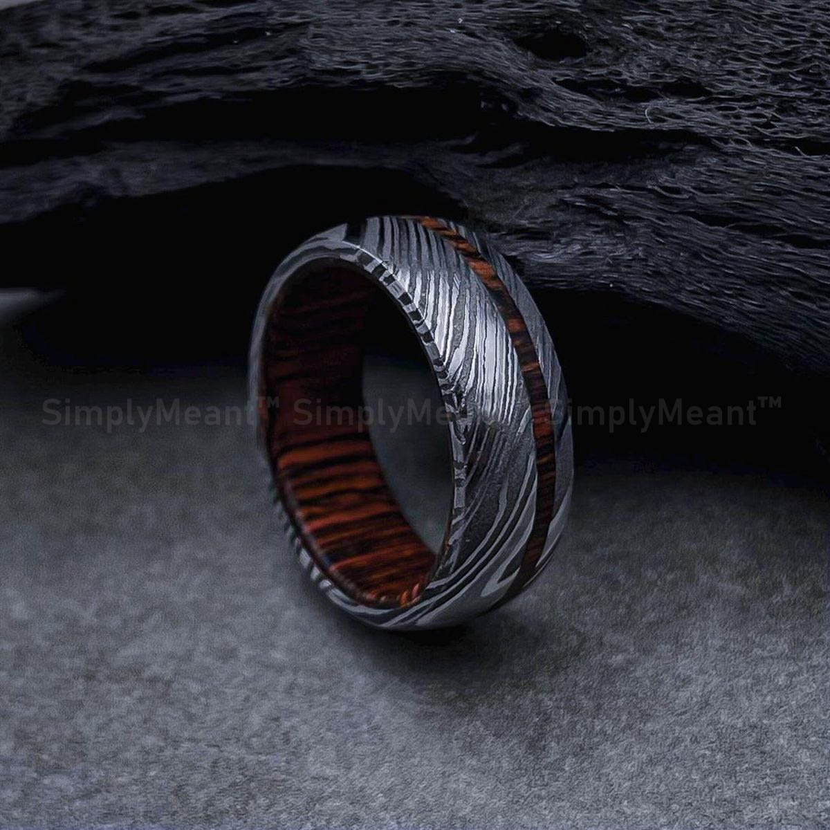 8MM DAMASCUS STEEL BAND WITH DARK HARDWOOD SLEEVE WOOD INLAY