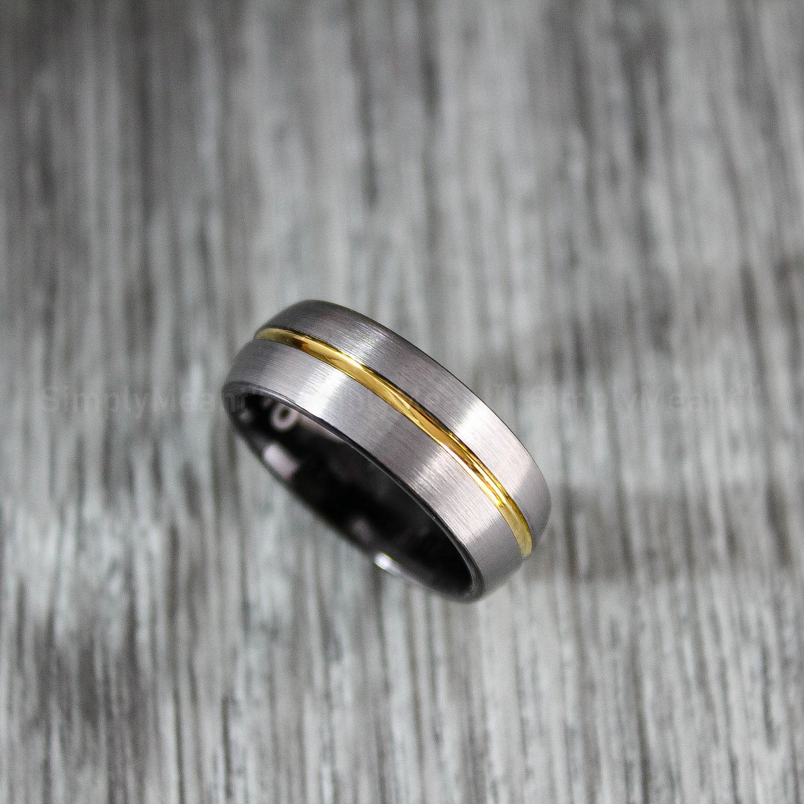 Silver Tungsten Wedding Band, Silver Wedding Ring with Yellow Gold Groove